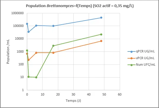 On remarquera que les valeurs par qPCR sont stables, attestant que cette méthode surestime le résultat en dosant les cellules mortes, durant 50 jours dans le cadre de notre essai. Les valeurs de cellules viables et cultivables (numération en UFC/mL) sont faibles et sous-estiment le risque réel du fait du stress lié au sulfitage et donc du passage en VNC d’un grand nombre de cellules. Les valeurs données par la méthode vPCR représentent les populations viables et VNC. Le résultat est logiquement intermédiaire par rapport à la qPCR et la numération.