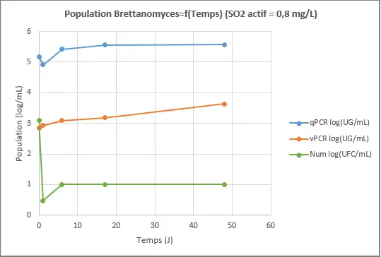 Cet essai de sulfitage montre que la couverture en SO2 permet de réguler des populations de Brettanomyces. 0,35 mg/L de SO2 actif sont insuffisants pour assurer une protection : en quinze jours, les populations remontent à un niveau problématique. 0,8 mg/L de SO2 actif assurent une bonne protection, mais de nombreuses Brettanomyces VNC restent présents. Le SO2 à dose suffisante est donc un moyen efficace pour contenir Brettanomyces.