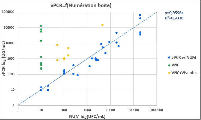 - En jaune, les résultats positifs par vPCR et par culture, mais dont les valeurs sont systématiquement plus élevées par vPCR que par culture sur boîte de Petri. Il s’agit de populations mixtes, comportant à la fois des cellules viables, donc détectées aussi bien par culture que par vPCR et des cellules VNC détectées uniquement par vPCR.